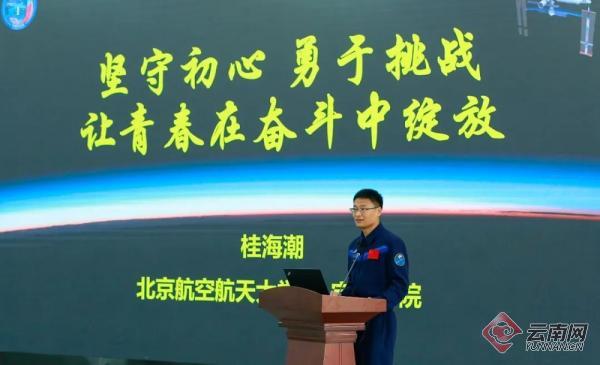 5月6日,北京航空航天大学教授、博士生导师,神舟十六号乘组英雄航天员桂海潮,回到母校保山市施甸县第一完全中学作专场报告,给学弟学妹们带来题为《坚守初心 勇于挑战 让青春在奋斗中绽放》的精彩内容,用具体事例和切身体会生动讲述自己的奋斗青春,激励莘莘学子立志努力学习、报效祖国。