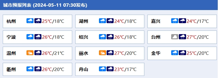 根据浙江省气象台最新预报,今天,全省阴有阵雨或雷雨,部分中到大雨,其中浙中北和浙西地区局地暴雨。