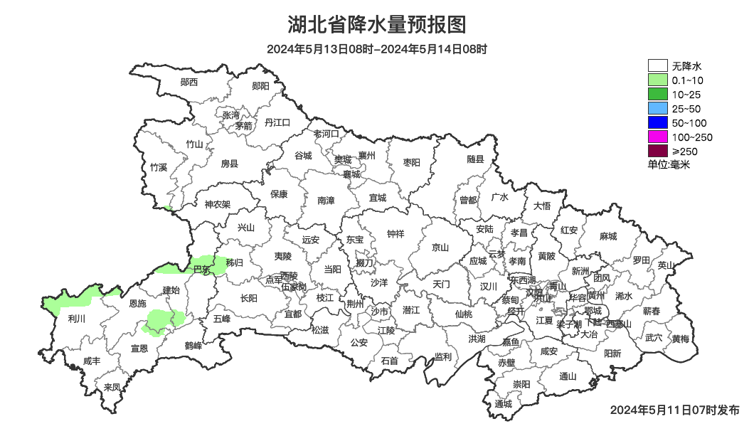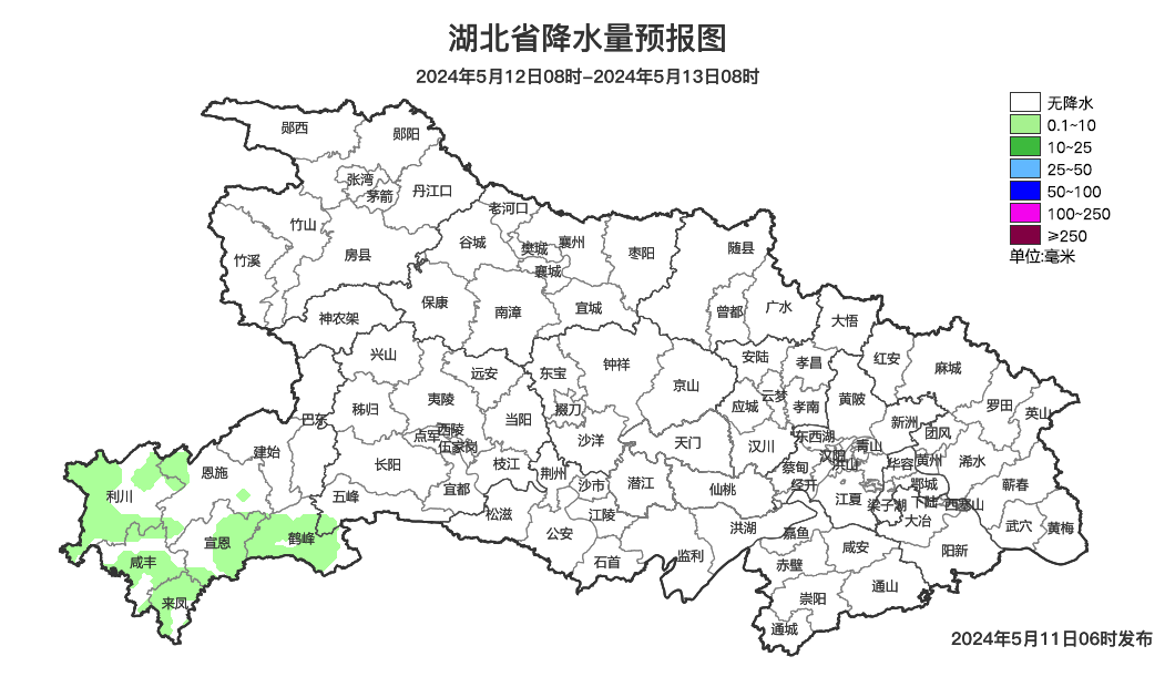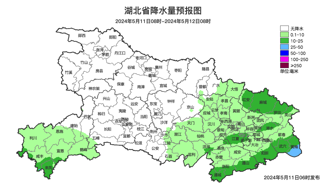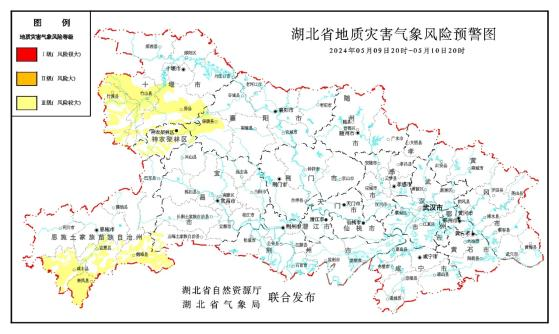 5月10日20时—5月11日20时,预计鄂州市、咸宁地区、黄石地区,恩施(利川南部、咸丰、来凤、宣恩、鹤峰)、宜昌(五峰)、黄冈(黄州区、罗田、英山、浠水、蕲春、武穴、黄梅)以及其他强降水区域发生崩塌、滑坡、泥石流的风险较大。