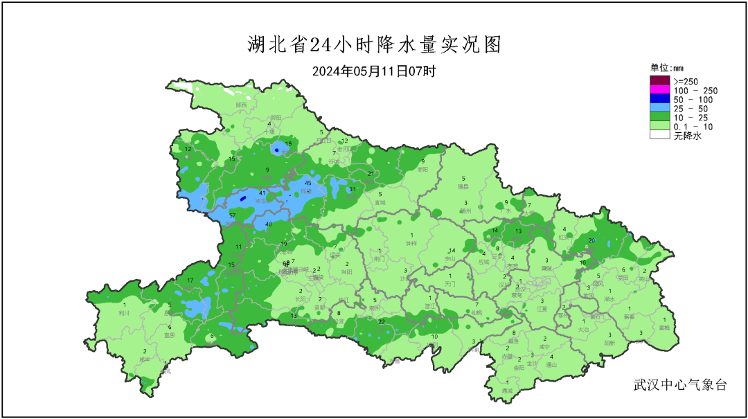 昨日07时至今日07时,鄂西南、鄂西北南部、江汉平原南部、鄂东北出现中到大雨,局部出现暴雨,最大累计雨量80.1毫米,其他地区出现小雨、局地中雨。最高气温恩施地区20~23℃、其他地区26~29℃。