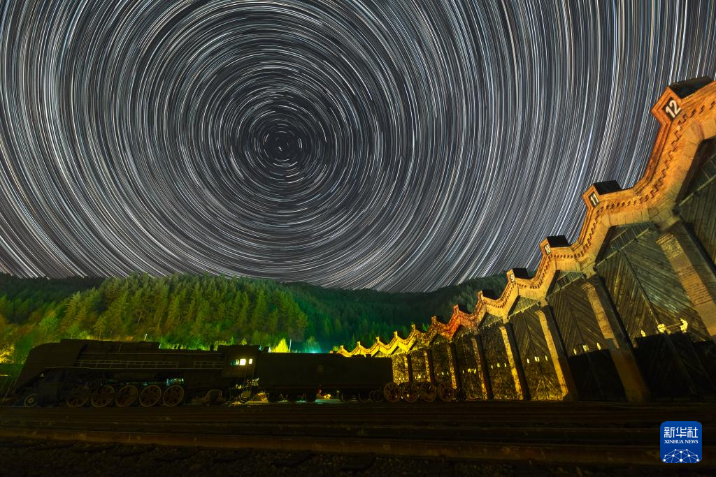 星轨之下的中东铁路博物馆机车库(堆栈合成照片,2024年5月7日摄)。
