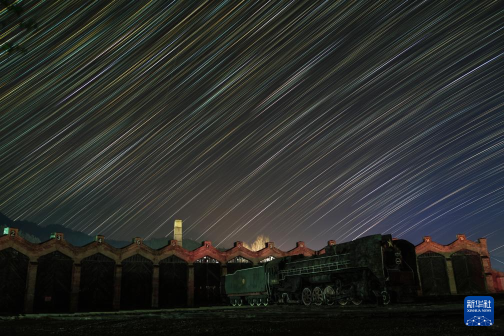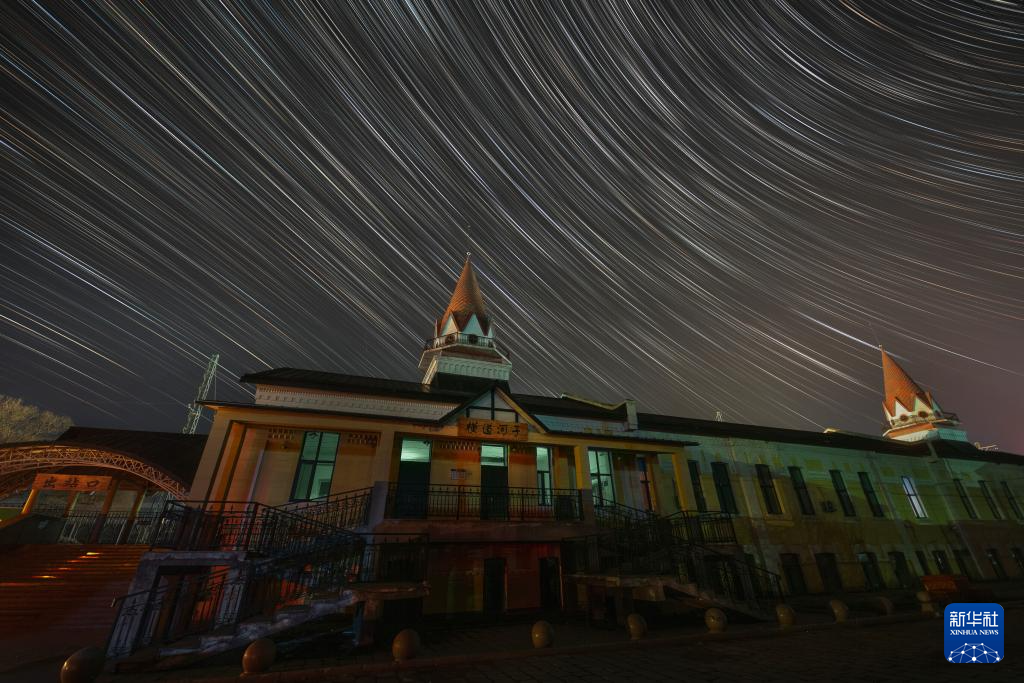 星轨之下的横道河子火车站(堆栈合成照片,2024年4月14日摄)。