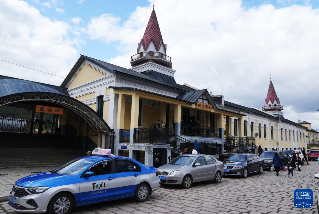 出租车在拥有百年历史的横道河子火车站前等客(2023年9月30日摄)。