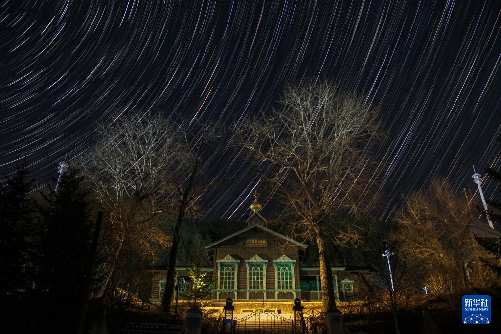 星轨之下的中东铁路博物馆展区(堆栈合成照片,2024年4月13日摄)。