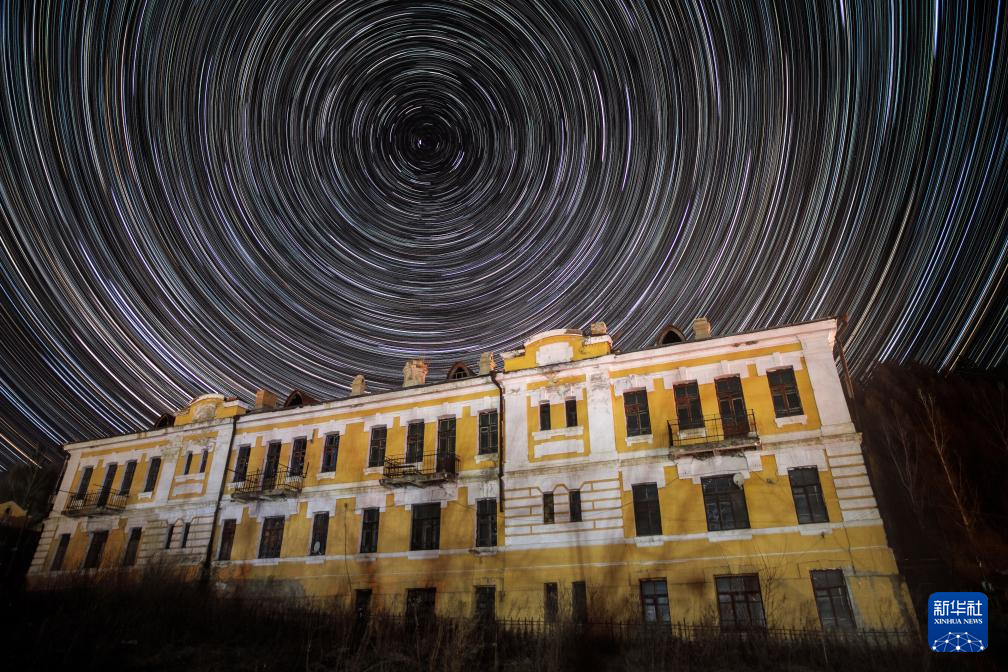 星轨之下的俄式建筑“大白楼”(堆栈合成照片,2024年4月4日摄)。