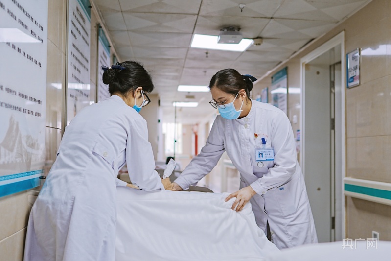 河南中医药大学第一附属医院的病房内,护士长刘杨春(右)与同事乔世杰正忙碌于日常工作之中(央广网记者 张羲轮 摄)
