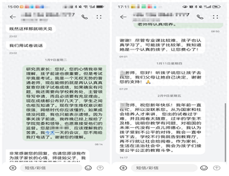 据报道,今年1月,涉事老师先是接到一名陈同学家长的电话,自称是某研究院的研究员,因孩子是本硕连读,成绩不合格会影响其前途,要求为孩子修改成绩;又连续接到学院教务员和学院领导的电话,要求为该生改成绩,并提到该学生家长是某研究院的院士团队成员;随后学校组织了补考,由另一位课题组组长出题和阅卷,该同学补考成绩合格;同时,另外一名补考未通过的学生威胁要跳楼,补考成绩被人修改为60分。