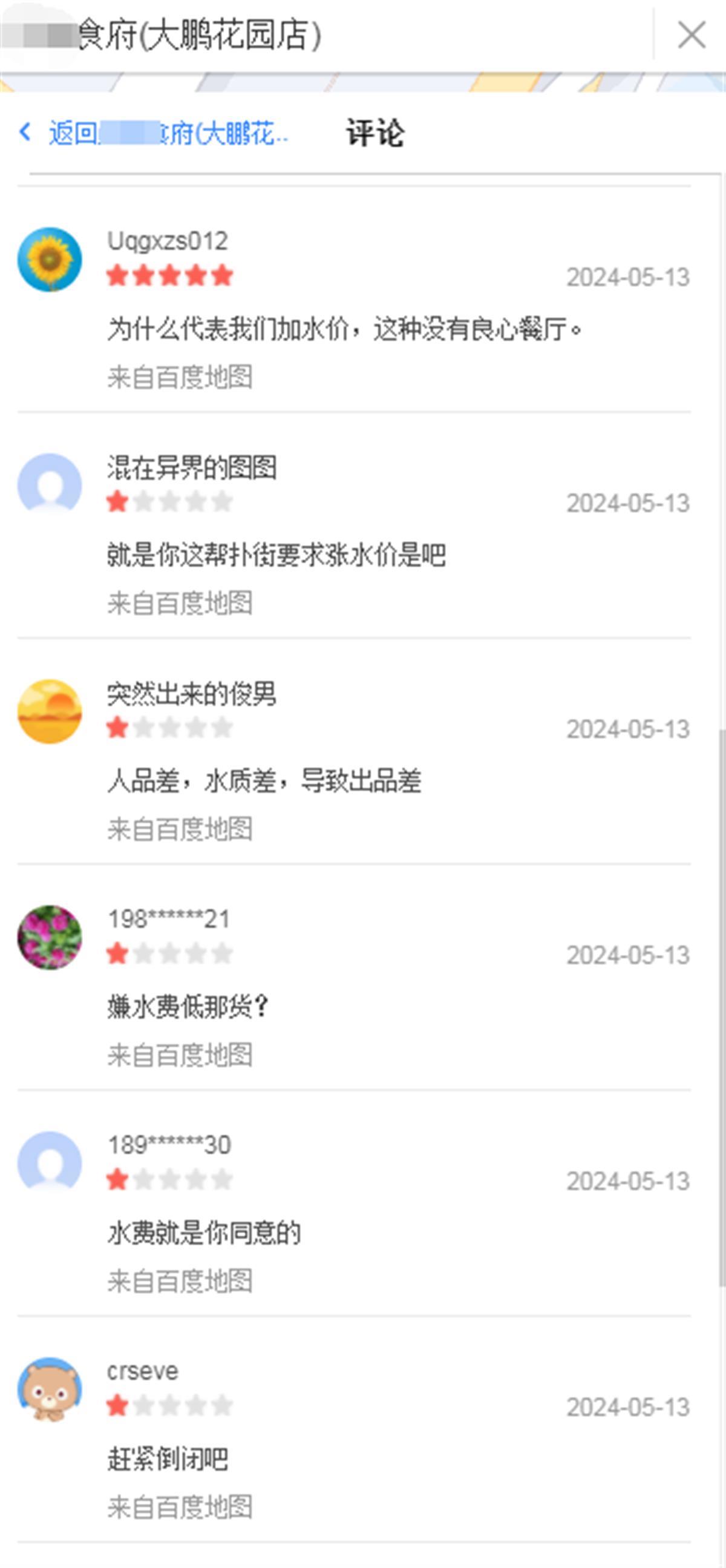 5月13日,极目新闻记者注意到,网上流传出一份参加此次听证会的17名人员信息,其中有一名非居民消费者为黄某辉,其工作单位为广州市荔湾区某食府。在百度地图上,多名网友在该餐馆的评论区对其进行攻击,不满其工作人员在听证会上支持自来水涨价。该餐馆在某APP的评论区,也因上述原因遭到多名网友的攻击,得到差评。