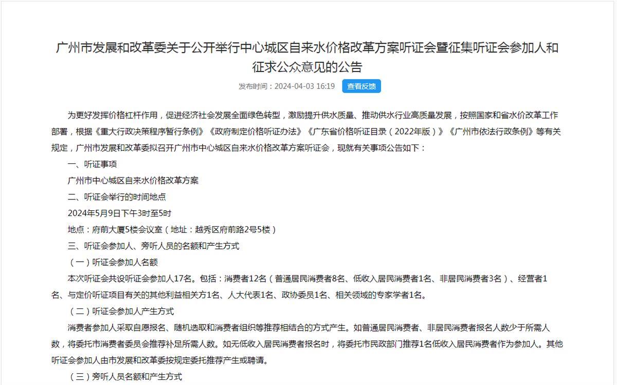 极目新闻记者注意到,2024年4月3日,广州市发改委在其官网上发布了《广州市发展和改革委关于公开举行中心城区自来水价格改革方案听证会暨征集听证会参加人和征求公众意见的公告》。公告显示,本次听证会共设听证会参加人17名,包括消费者12名(普通居民消费者8名、低收入居民消费者1名、非居民消费者3名)、经营者1名、与定价听证项目有关的其他利益相关方1名、人大代表1名、政协委员1名、相关领域的专家学者1名。其中,消费者参加人采取自愿报名、随机选取和消费者组织等推荐相结合的方式产生。如普通居民消费者、非居民消费者报名人数少于所需人数,将委托市消费者委员会推荐补足所需人数。如无低收入居民消费者报名时,将委托市民政部门推荐1名低收入居民消费者作为参加人。其他听证会参加人由市发展和改革委按规定委托推荐产生或聘请。