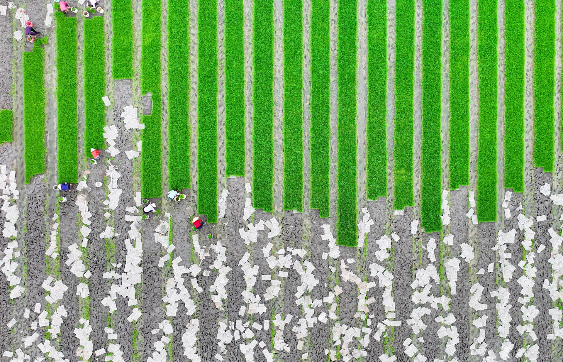 2024年4月25日,江西省吉安市遂川县邵溪村村民在标准化育秧基地移栽早稻秧苗。
