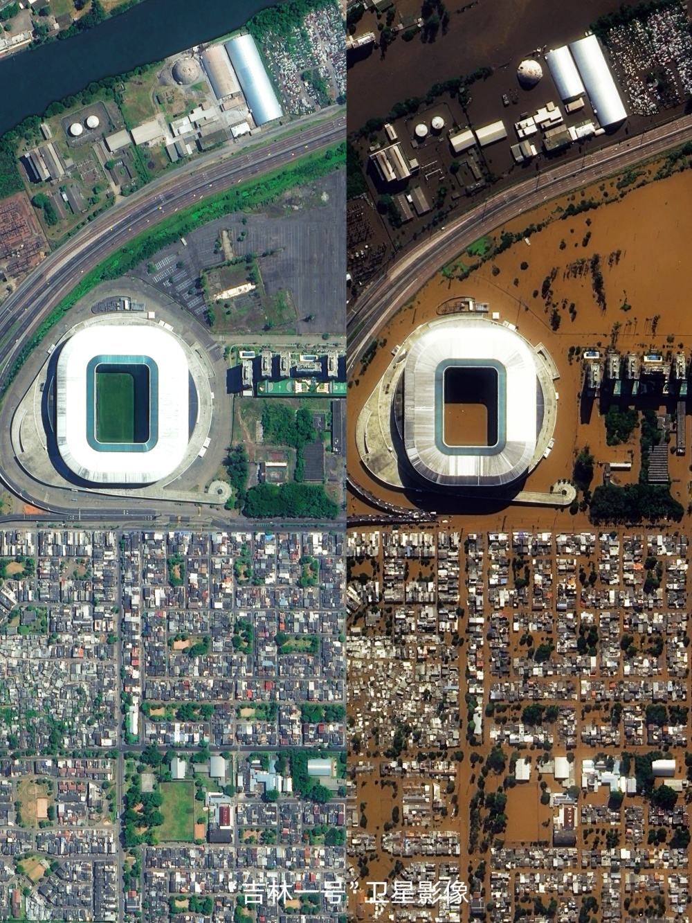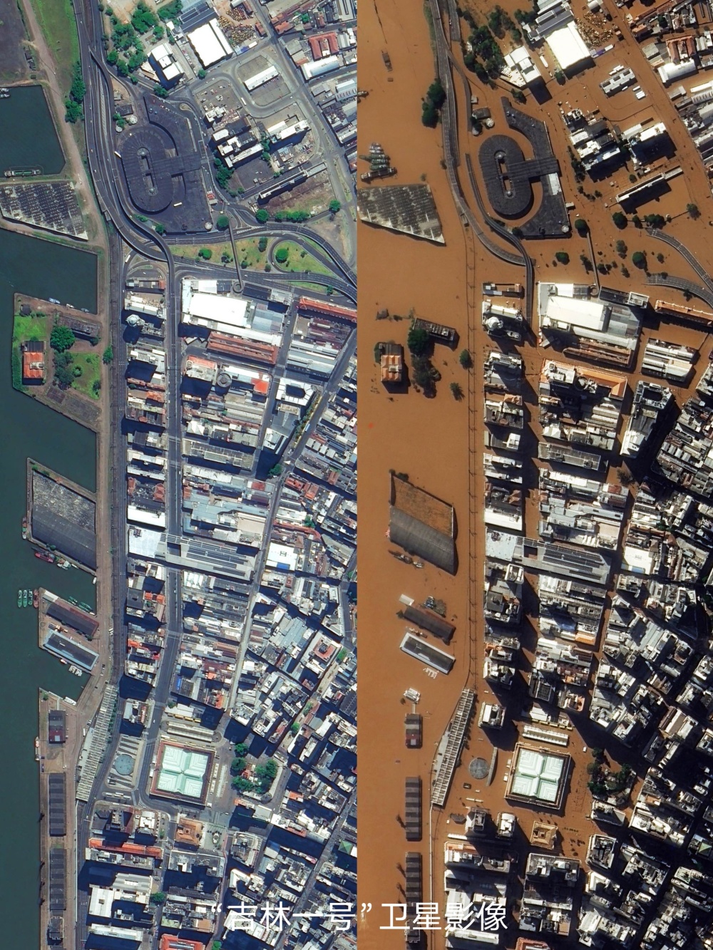 中国长光卫星公司“吉林一号”卫星拍摄的遥感图像对比显示,靠近阿雷格里港轮渡码头的街区受灾情况严重,格雷米奥竞技场附近道路、小萨尔加杜机场跑道已完全被洪水淹没。若瓜伊巴河水位继续上涨,当地受灾情况将更加严重。