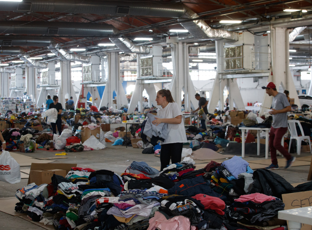 5月6日,在巴西南里奥格兰德州新汉堡,志愿者在避难所内为受灾民众分发救灾物资。新华社发(克劳迪娅·马尔提尼摄)