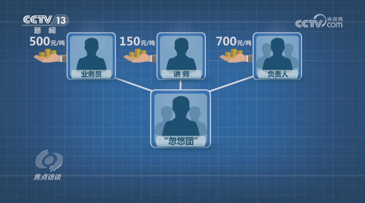 氯化铵和硫酸铵都属于氮肥的生产原料,成本价约为800—900元/吨。据专案组调查,几个代工厂将原料简单搅拌装袋后,卖给定制化肥的总经销商张某华,价格就变成1100—1200元/吨,中间差价约300元/吨;总经销商张某华把化肥交付给代理商张某昌,价格为1375元/吨,差价约200元/吨;张某昌转卖给实体“忽悠团”的价格为1900元/吨,中间差价约500元/吨;“忽悠团”卖给农户的最终价格为3250元/吨,其中:业务员每吨抽成500元,讲师每吨抽成150元,“忽悠团”几位负责人每吨获利700元。就这样,每吨成本不到1000元的氮肥,披着复合肥的外衣,在农户手里翻了三倍多。