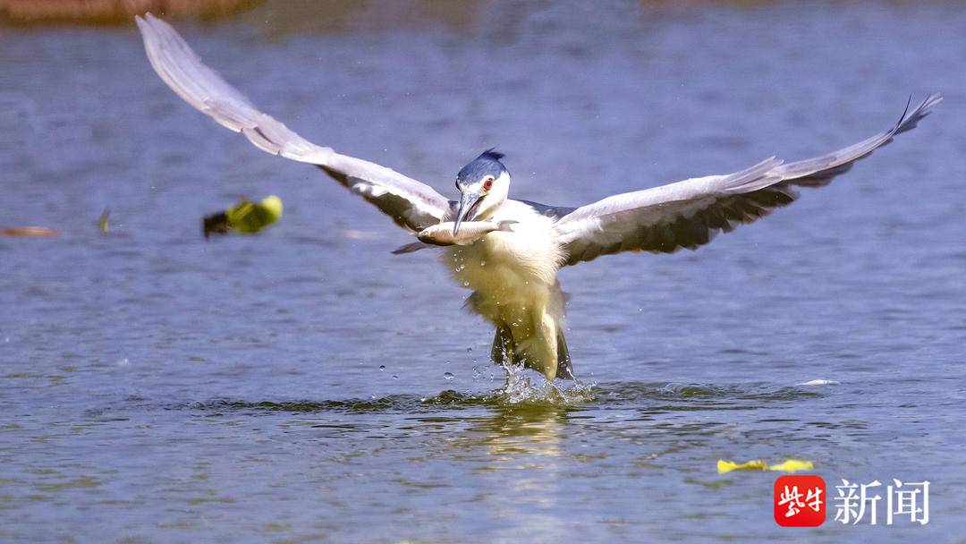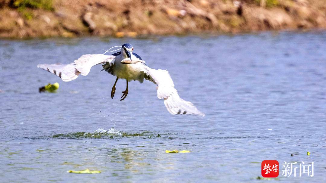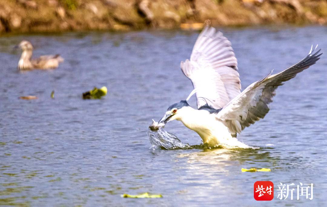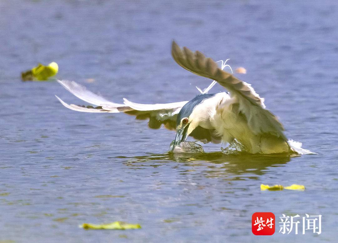 日前,又一种不知名鸟类现身江苏省连云港市灌云县侍庄街道瓦房村侍荷园,当地摄影师周永成拍下了一组此鸟捕鱼的全过程。“当天早上,我在藕塘边的草丛中蹲守了近一个小时,才发现了它。怕来不及拍到精彩镜头,就设置了连拍模式,拍下了它从静立不动、入水捕鱼到飞起离开的全过程。尤其是用嘴巴衔鱼飞离水面的那一刹那间,感觉它看似呆萌,实质很凶猛。”