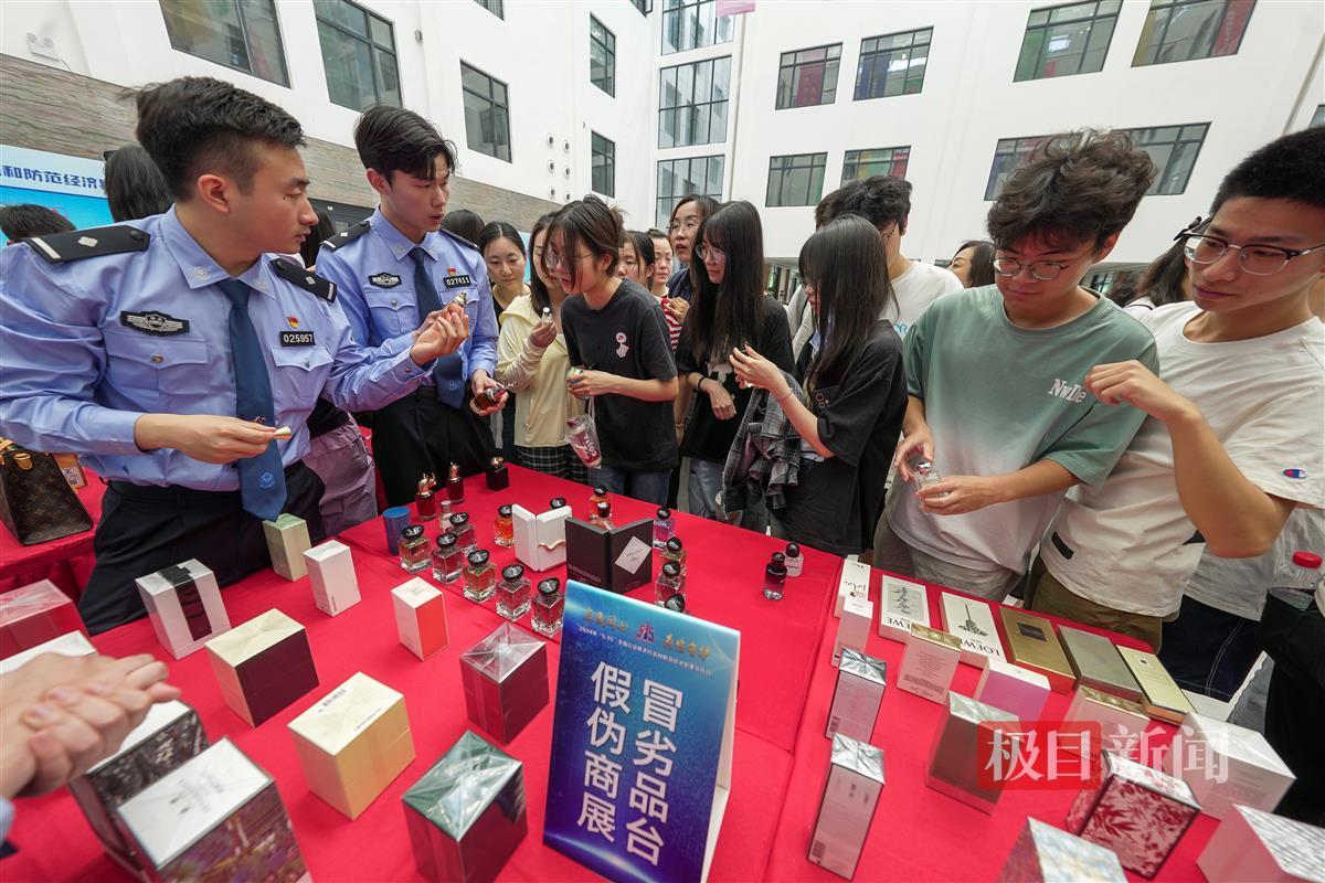 “怎样辨别假冒伪劣商品?我们可以采取‘看、摸、比’三步法:细看商标、触摸标识、对比包装。”在实物展示区,各式各样的香烟、白酒、化妆品、皮包等铺满了一张张展台,吸引了大量师生围观。民警介绍,这些都是近年来警方查扣的假冒伪劣商品,并现场讲解各类识假辨假知识。