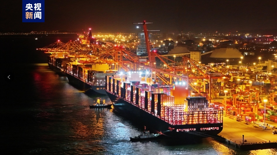 夜幕下,三艘“巨无霸”依次排开,红白相间的桥吊吊臂下,集装箱不断穿梭来回,嵩屿作业区2-4号泊位(海通码头+嵩屿码头)桥吊火力全开,全力迎接三艘巨轮的到访。