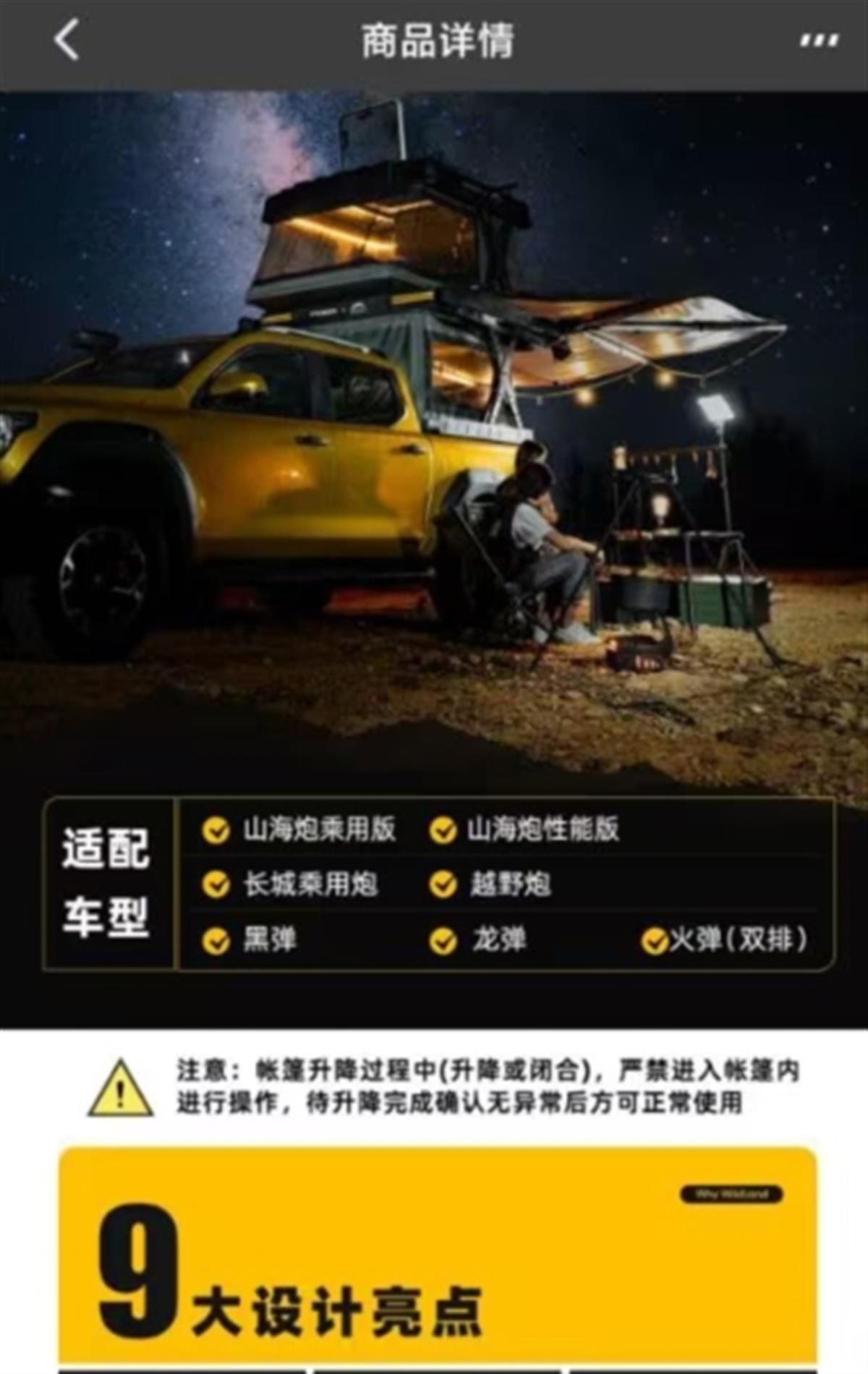 长城炮小程序页面显示,山海居帐篷已售罄。在秋野地电商平台旗舰店里,适配长城炮车型的山海居帐篷则正在预售。客服介绍,预售后大概要等到月底发货,这款帐篷正常升起来用时约90秒,具体用时要看电量情况;如果按照产品说明书或操作视频正确使用,产品是安全的,后续产品若有更新也会在页面上更新。