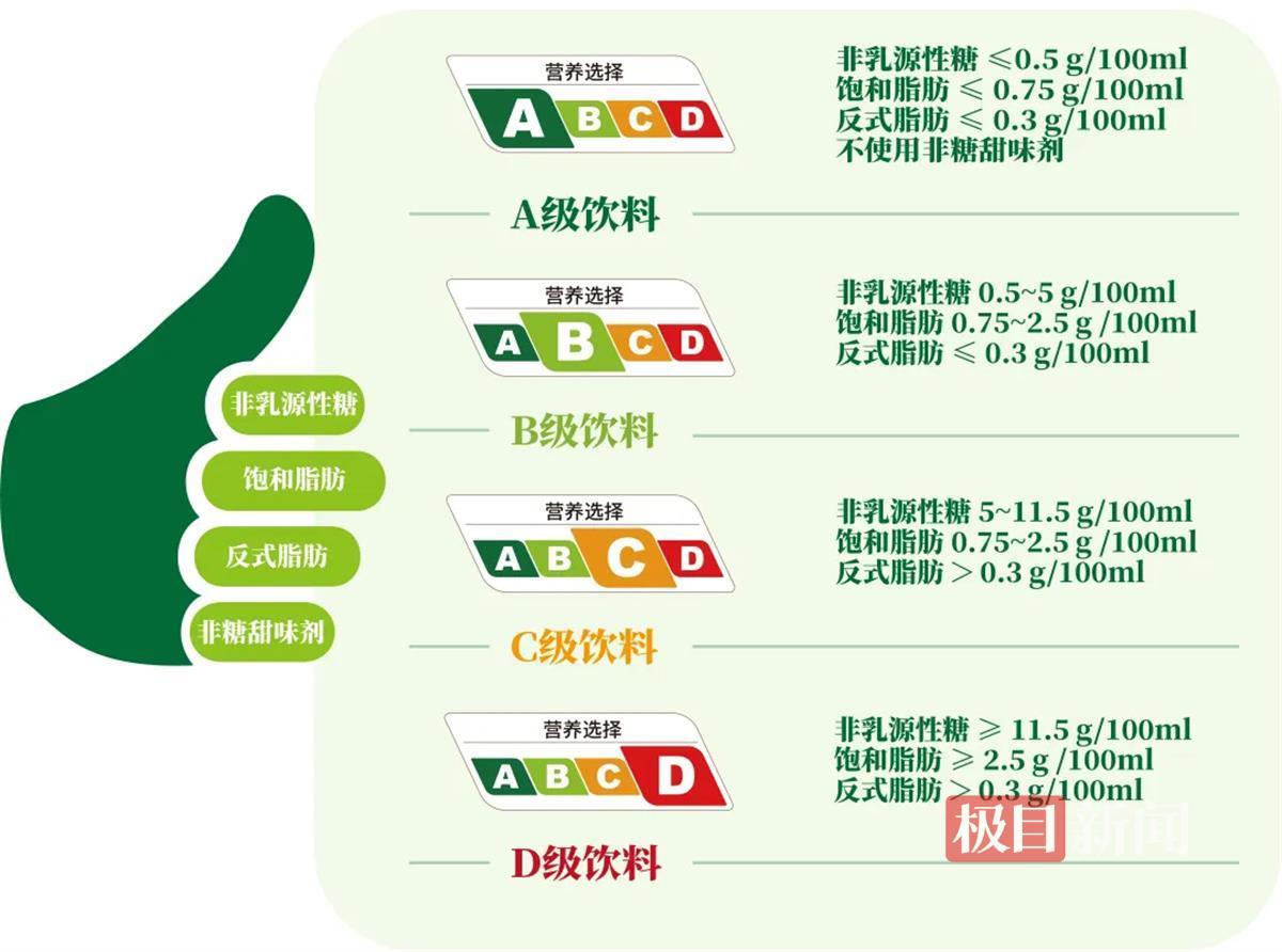 根据上海市疾病预防控制中心3月底发布的资料,“营养选择”饮料分级方法主要参考国内外标准,考虑饮料营养成分分布及人群饮料摄入情况,最终根据饮料中非乳源性糖、饱和脂肪、反式脂肪、非糖甜味剂的含量对饮料进行综合分级,分级从A到D级,其推荐程度递减。ABCD四个等级,综合反映饮料中含有糖、脂肪等成分的情况,一眼就能看出哪个更健康。起初共有4家企业参与“营养选择”标识试点,今年将陆续在上海区域的产品销售菜单、饮料外包装、线上点单程序及售卖场所等醒目位置,标注符合要求的“营养选择”分级标识。