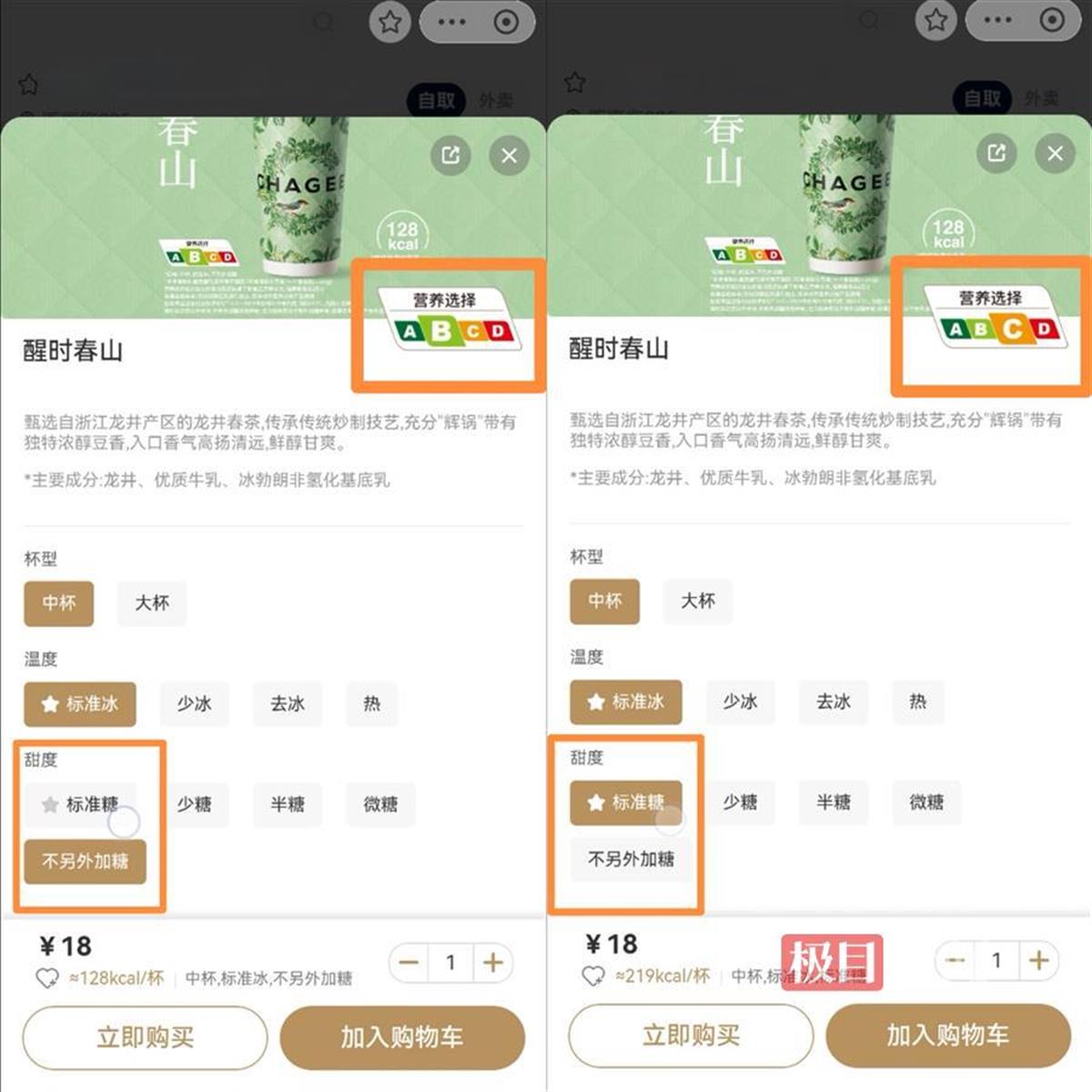 一家霸王茶姬门店的一份菜单上显示了16款饮品,其中4款被划分为A级,剩余12款被划为B级。记者注意到,附带的解释标识中有一项说明提到,相关营养分级是对“不另外加糖”规格所作的评级。门店的线上点单程序中,也对不同饮品的营养等级进行了标注,且同一款饮品的等级也会随不同的加糖量(甜度)变化。以饮品“醒时春山”为例,“标准冰”温度条件下,中杯“不另外加糖”“微糖”的等级均为B,切换为中杯“标准糖”后,饮品则被划为了C级。