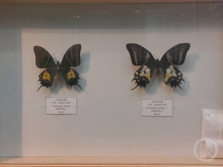 在昆虫展厅,展出了金斑喙凤蝶、海伦娜闪蝶、绢蝶、猫头鹰环蝶等蝴蝶。上游新闻记者看见,每一只蝴蝶下方都标记有保护级别、英文名、产地以及采集时间。其中,金斑喙凤蝶排名世界八大名贵蝴蝶之首,是我国唯一的蝶类国家一级保护动物。它外观异常美丽,姿态高贵华丽,素有“蝶中皇后”美誉。