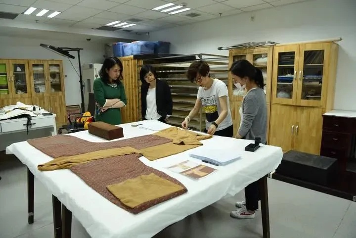 南京云锦研究所文物修复部主任杨冀元(右二)在湖南博物院交付此次的仿制品。(受访者供图)