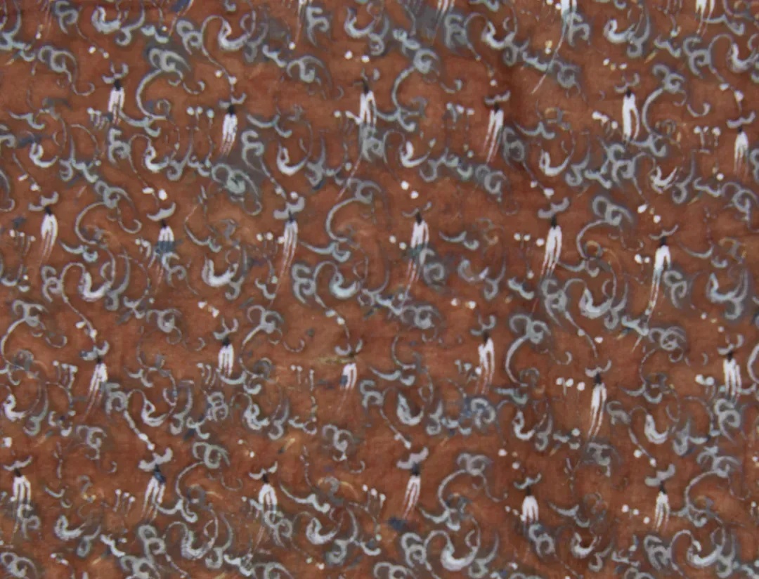 专家推测,枝蔓部分的印纹细密、分布均匀、交叉处有明显断纹,说明这是用镂空版印制而成。而花、叶及蓓蕾部分的纹样各不相同,色彩有浓有淡,应是手工一笔一笔画上去的。