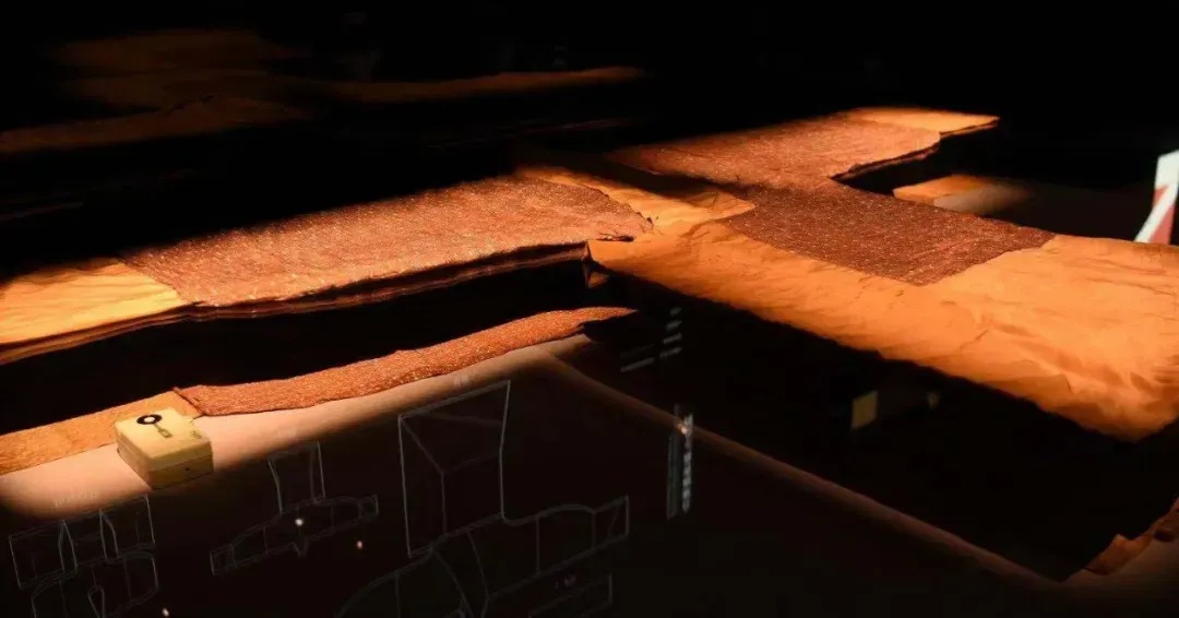 杨冀元和团队将仿制的衣服放在原文物上方比对大小。(受访者供图)