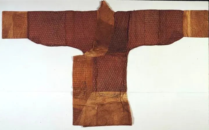 印花敷彩纱直裾丝绵袍出土于马王堆一号汉墓,是辛追夫人生前最喜爱的服饰之一。其面料为印花敷彩纱,里、袖、领、缘为绢,内絮丝绵,是目前世界上发现最早的印花与彩绘相结合的丝织品。一号墓竹笥共出土3件印花敷彩纱丝绵袍,其款式基本相同。