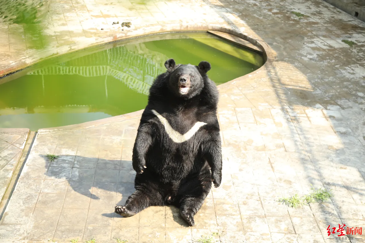 5月17日上午,记者在黑熊馆看到,“耐克熊”多了一个小伙伴,这是只母熊,之前一直在休养生息,最近才放出来。吃过早餐,两只熊在水里尽情嬉戏,兴致好的时候,“耐克熊”坐直身体,向游客招手打招呼,高兴的时候,还会转几个圈圈。