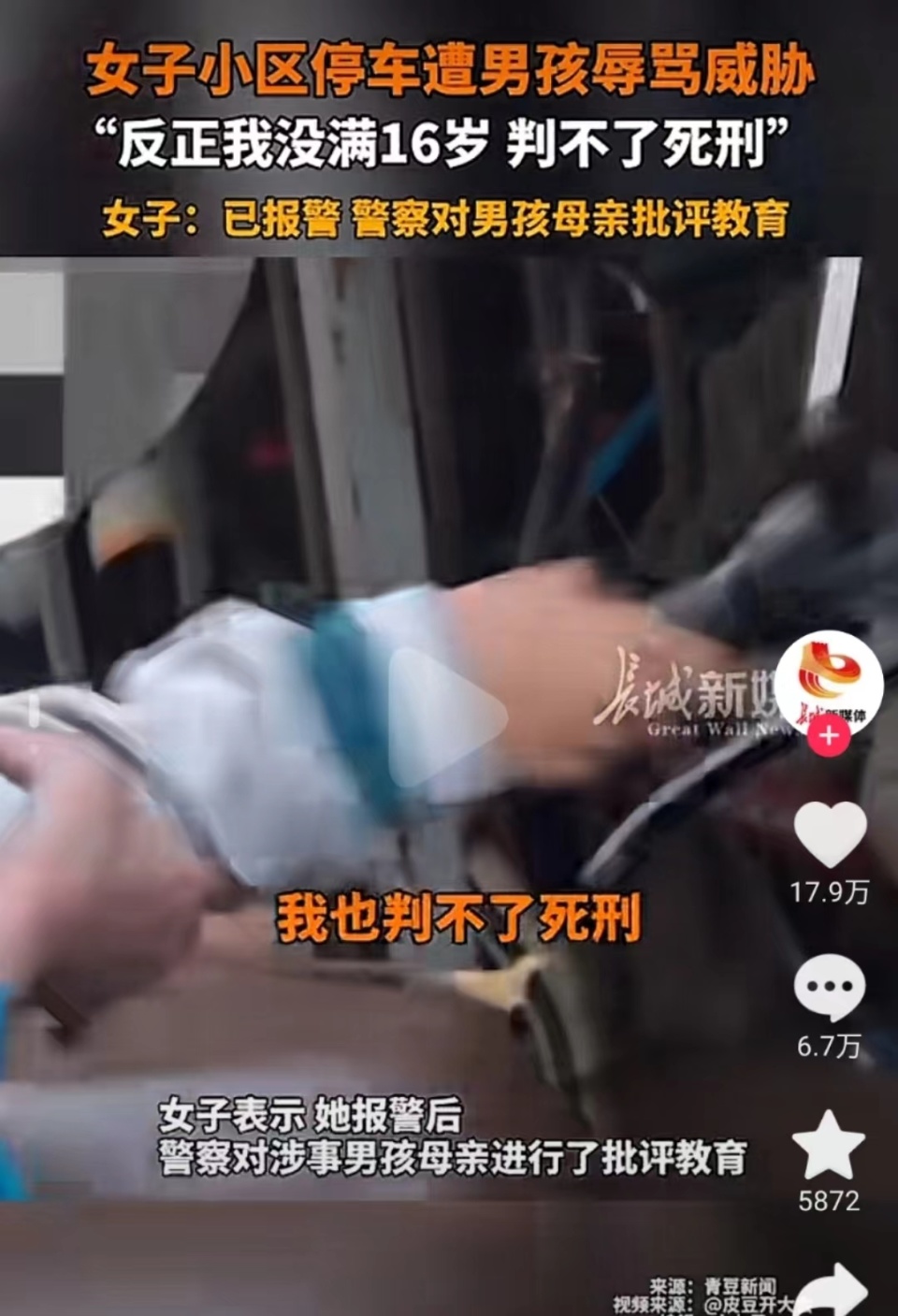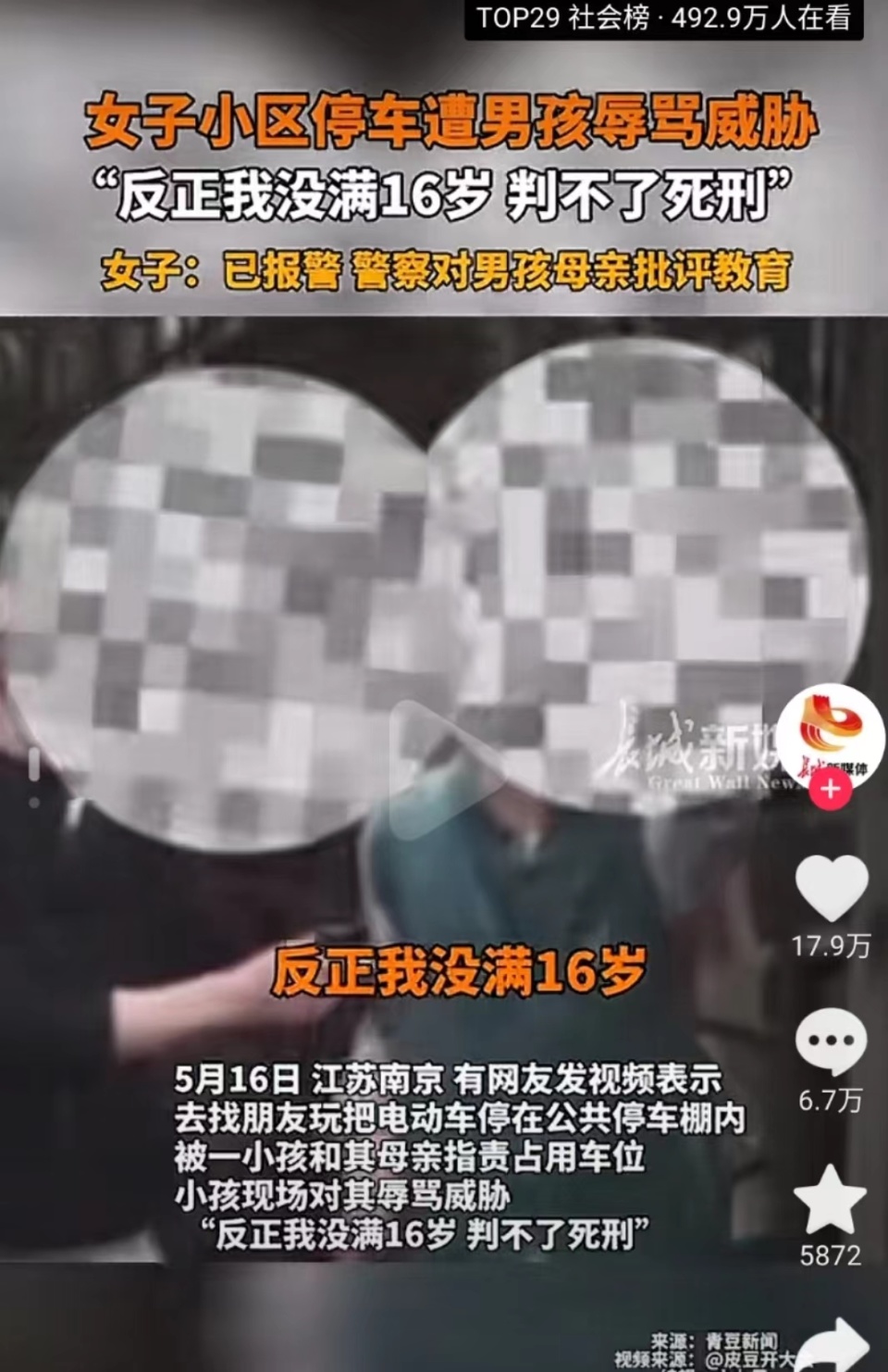据苏州广电小鱼视频报道,5月16日,江苏南京,网友发视频称,自己去找朋友玩,在楼下停电动车时,被一男孩和其母亲指责占用车位不让停,还言语威胁,男孩称“反正我没满16岁,判不了死刑”引发网友热议。