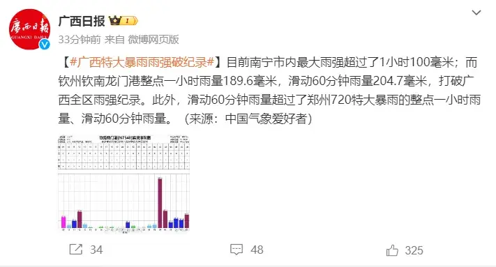 据@广西日报,南宁市内最大雨强超过了1小时100毫米;而钦州钦南龙门港整点一小时雨量189.6毫米,滑动60分钟雨量204.7毫米,打破广西全区雨强纪录。此外,滑动60分钟雨量超过了郑州720特大暴雨的整点一小时雨量、滑动60分钟雨量。