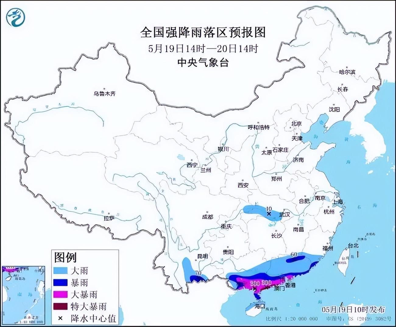 中央气象台19日10时发布暴雨橙色预警:预计,19日14时至20日14时,广西南部、广东大部、福建南部、云南东南部、海南岛北部等地部分地区有大到暴雨,其中,广西南部、广东南部等地部分地区有大暴雨,广西东南部沿海、广东西南部沿海等地局地特大暴雨(250~300毫米)。上述部分地区伴有短时强降水(最大小时降雨量20~50毫米,局地可超过70毫米),局地有雷暴大风等强对流天气。