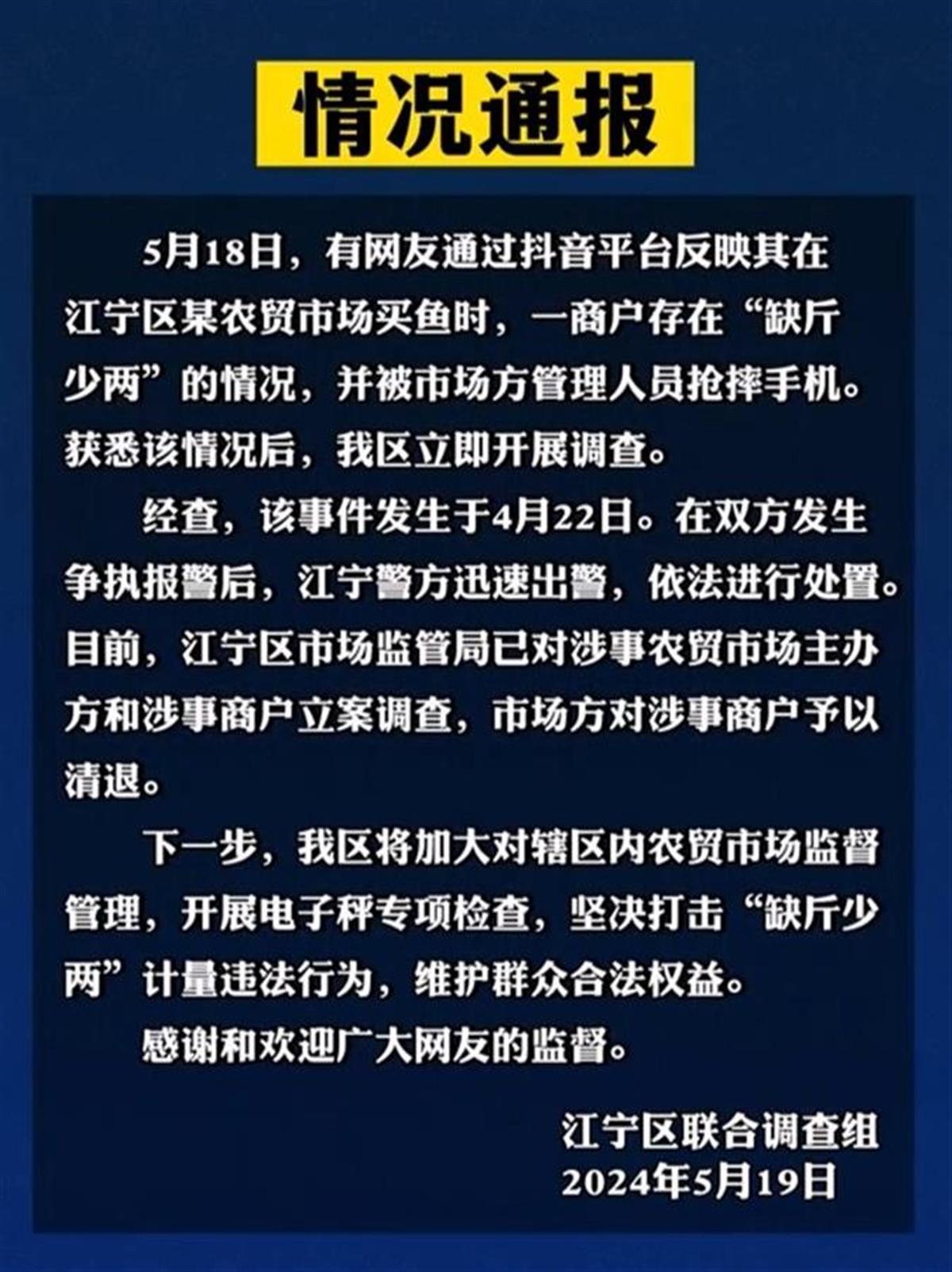 19日,“江宁发布”通报称,5月18日,有网友通过短视频网站反映其在江宁区某农贸市场买鱼时,一商户存在“缺斤少两”的情况,并被市场方管理人员抢摔手机。获悉该情况后,江宁区立即开展调查。经查,该事件发生于4月22日。在双方发生争执并报警后,江宁警方迅速出警,依法进行处置。目前,江宁区市场监管局已对涉事农贸市场主办方和涉事商户立案调查,市场方对涉事商户予以清退。该区将加大对辖区内农贸市场监督管理,开展电子秤专项检查,坚决打击“缺斤少两”计量违法行为,维护群众合法权益。