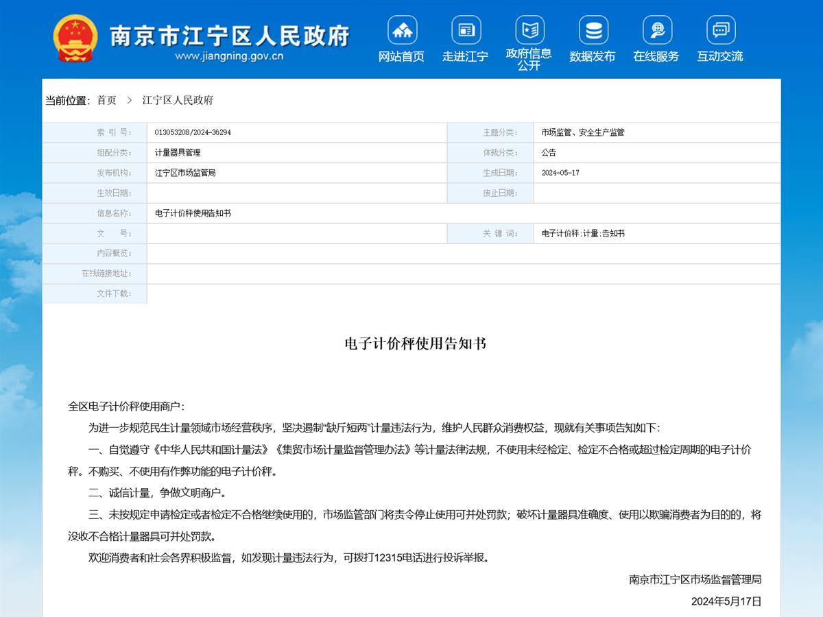 记者注意到,5月17日,江宁区市场监督管理局发布一份《电子计价秤使用告知书》,告知全区电子计价秤使用商户,为进一步规范民生计量领域市场经营秩序,坚决遏制“缺斤短两”计量违法行为,维护人民群众消费权益,现就有关事项告知如下:一、自觉遵守《中华人民共和国计量法》《集贸市场计量监督管理办法》等计量法律法规,不使用未经检定、检定不合格或超过检定周期的电子计价秤。不购买、不使用有作弊功能的电子计价秤。二、诚信计量,争做文明商户。三、未按规定申请检定或者检定不合格继续使用的,市场监管部门将责令停止使用可并处罚款;破坏计量器具准确度、使用以欺骗消费者为目的的,将没收不合格计量器具可并处罚款。