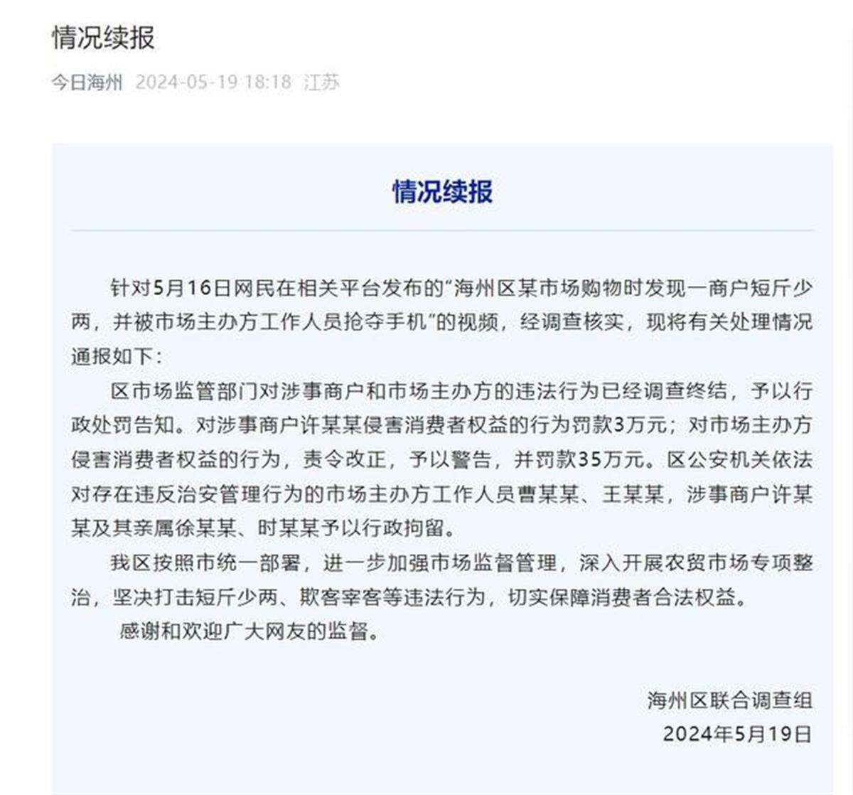 19日,连云港市海州区联合调查组发布情况续报:区市场监管部门对涉事商户和市场主办方的违法行为已经调查终结,予以行政处罚告知。对涉事商户许某某侵害消费者权益的行为罚款3万元;对市场主办方侵害消费者权益的行为,责令改正,予以警告,并罚款35万元。区公安机关依法对存在违反治安管理行为的市场主办方工作人员曹某某、王某某,涉事商户许某某及其亲属徐某某、时某某予以行政拘留。