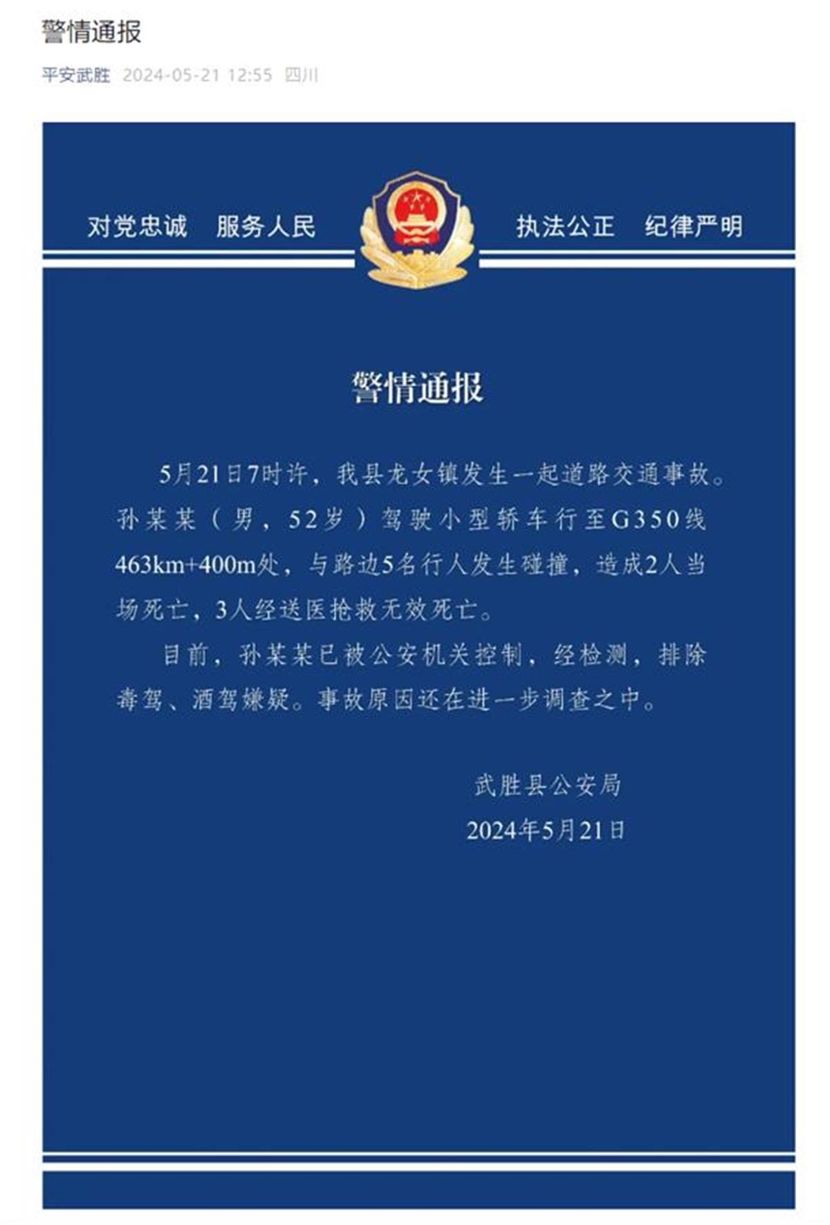 据武胜县公安局官方公众号“平安武胜”通报:5月21日7时许,武胜县龙女镇发生一起道路交通事故,孙某某(男,52岁)驾驶小型轿车行至G350线463km+400m处,与路边5名行人发生碰撞,造成2人当场死亡,3人经送医抢救无效死亡。
