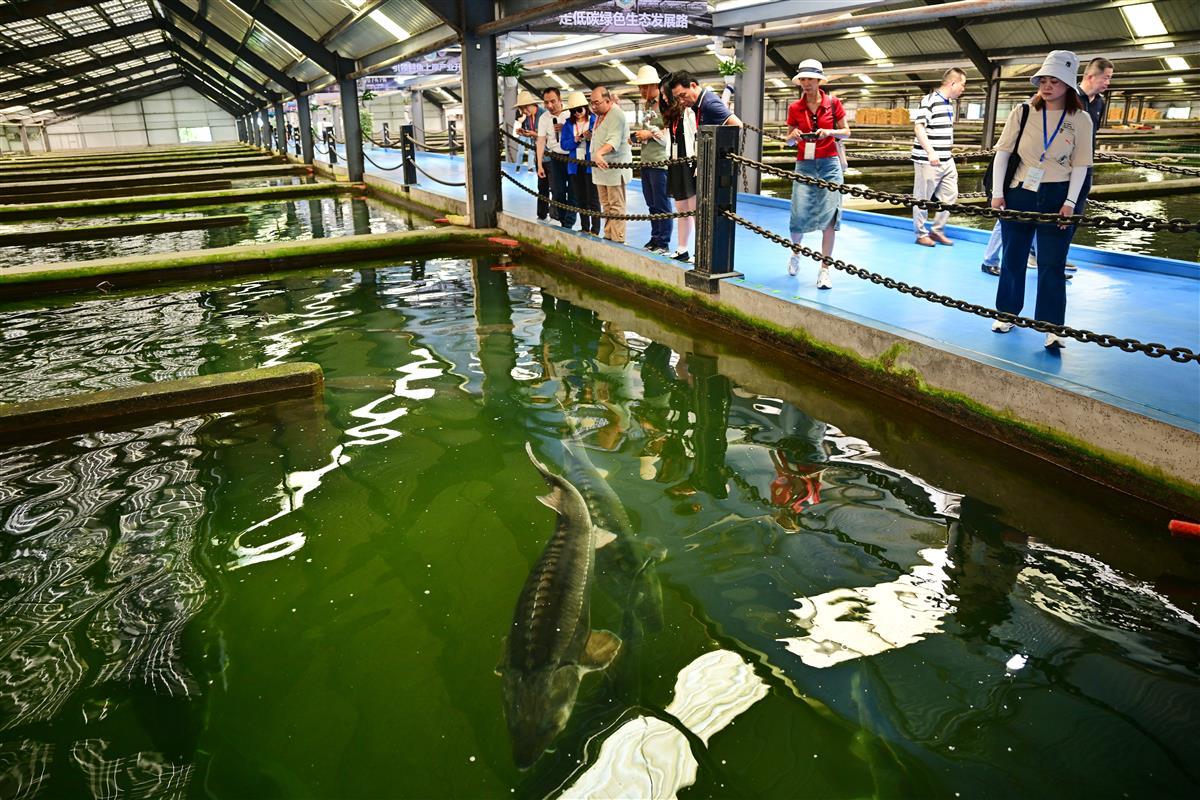 在中国清江(宜都)鲟鱼谷养殖车间内,华文媒体代表们看到鲟鱼正在水中自在游弋,纷纷感叹环保理念的创意。