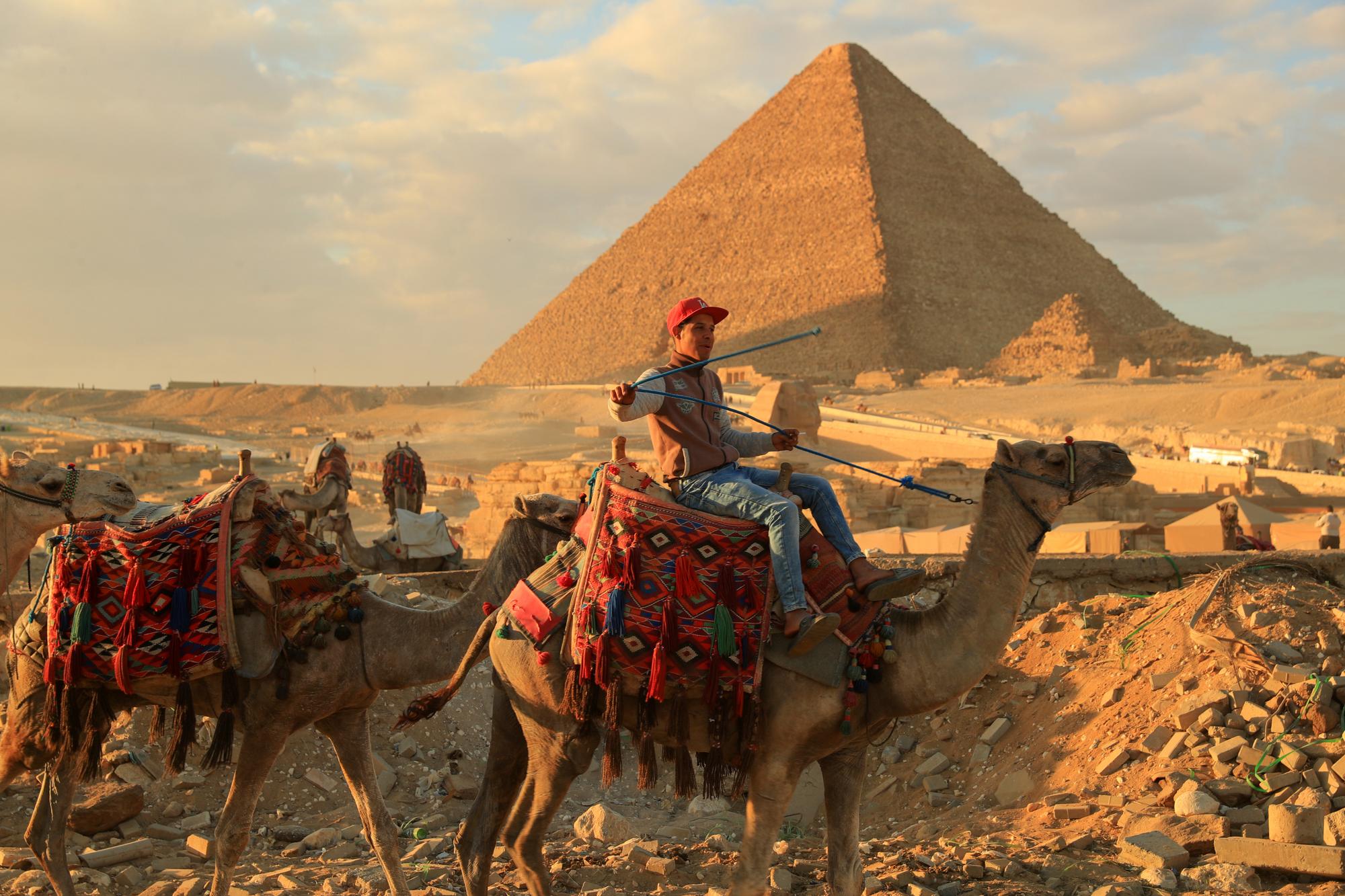 1月24日,商贩骑骆驼离开埃及吉萨金字塔景区。新华社记者隋先凯摄