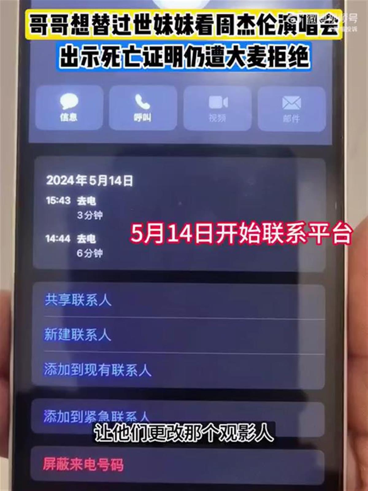 5月21日,王先生(化名)向“黑猫投诉”平台投诉称,自己的妹妹买了6月1日周杰伦长沙演唱会门票,然而不幸的是,妹妹在本月初因意外去世。见周杰伦是妹妹一直以来的愿望,王先生希望能替妹妹完成,于是从5月14日起向票务平台大麦申请更换观演人。但在他按要求出示了死亡证明、销户证明后,却仍被大麦拒绝,要求妹妹本人前往。(据5月21日红星新闻)