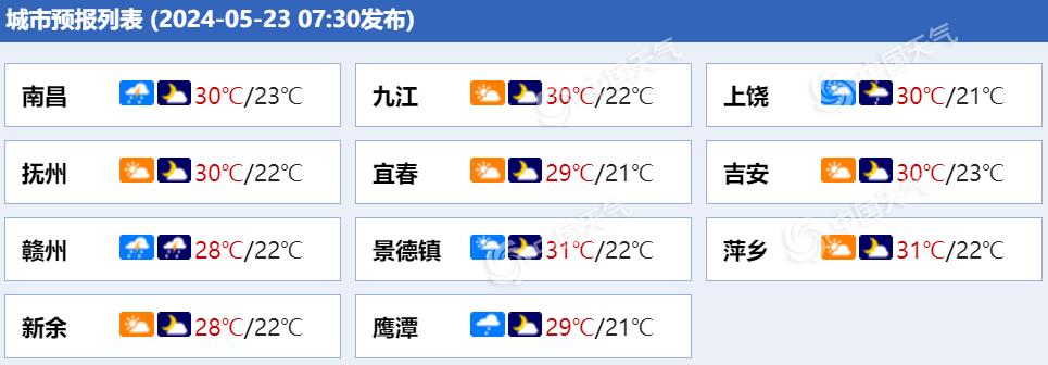 根据江西省气象台预报,今天,吉安、抚州、赣州三市和上饶市南部阴天多云,部分地区有阵雨或雷阵雨;全省其他地区多云间阴,局部地区有阵雨。最高气温:赣北、赣中29~31℃,赣南27~29℃。