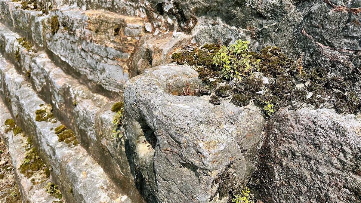 5月15日,在宜都市博物馆原馆长赵平的引领下,极目新闻记者前往合江楼沿岸,目睹了系船石。那是一些在岩石岸壁上凿出的圆孔,孔径约10厘米,正好供货船缆绳穿过,系泊固定。有些系船石上长满的苔藓,有些石孔破缺,写满着沧桑。