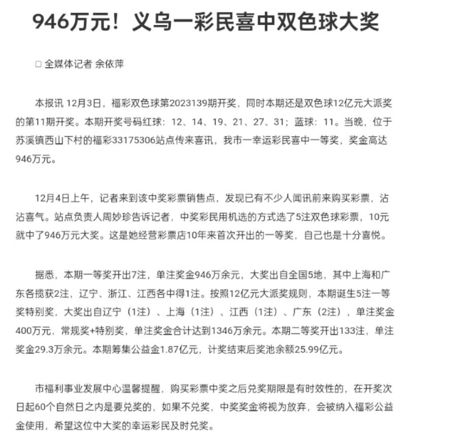 2023年12月3日晚,福彩双色球第2023139期开奖,义乌市一彩票店开出一等奖(机选),奖金946万元。