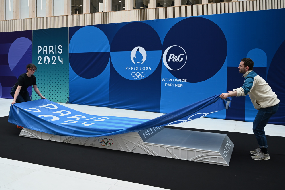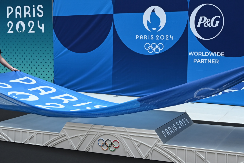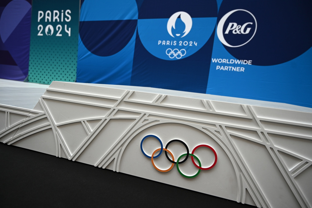 这是5月23日拍摄的巴黎奥运会领奖台设计揭晓仪式现场。新华社发(朱利安·马蒂亚摄)