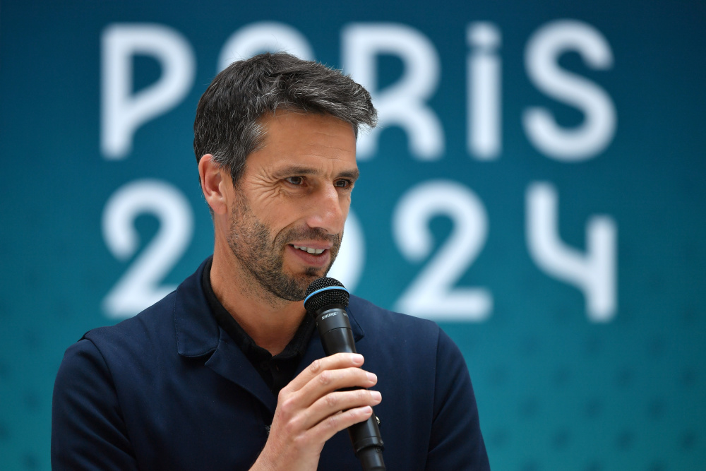 5月23日,巴黎奥组委主席埃斯坦盖在巴黎奥运会和残奥会的领奖台设计揭晓仪式上发言。新华社发(朱利安·马蒂亚摄)