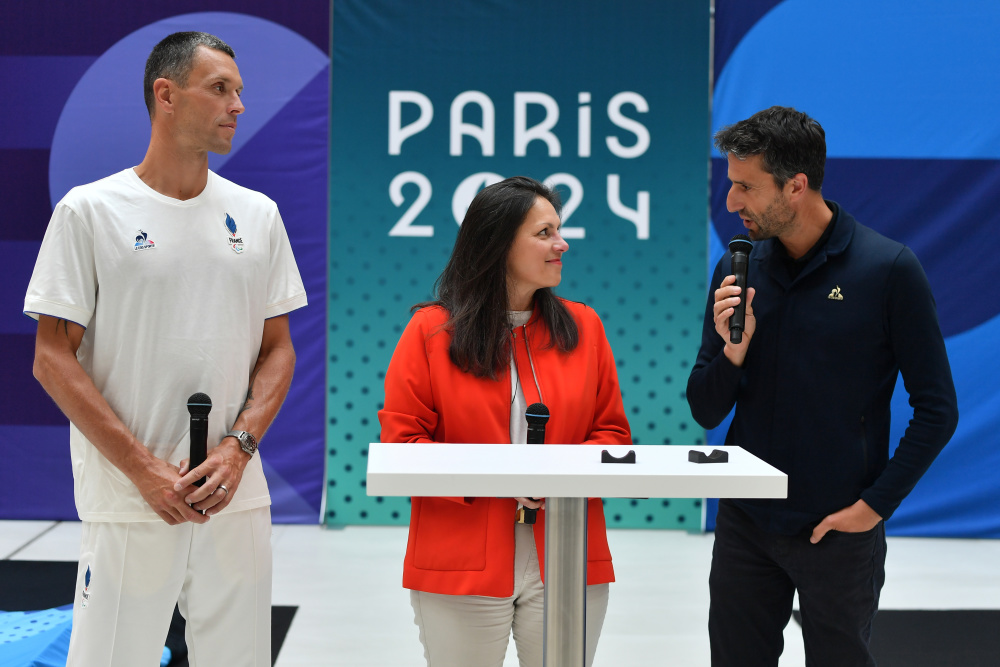 5月23日,巴黎奥组委主席埃斯坦盖(右)在巴黎奥运会和残奥会的领奖台设计揭晓仪式上发言。新华社发(朱利安·马蒂亚摄)