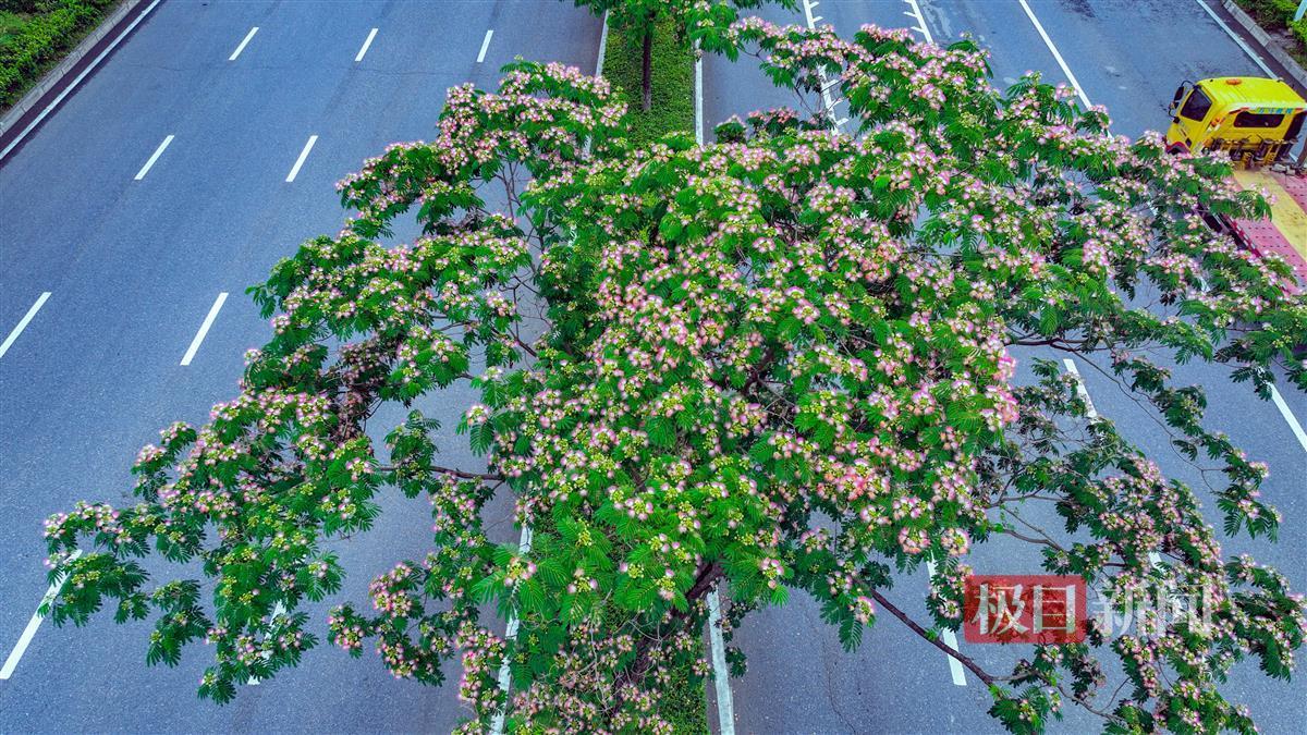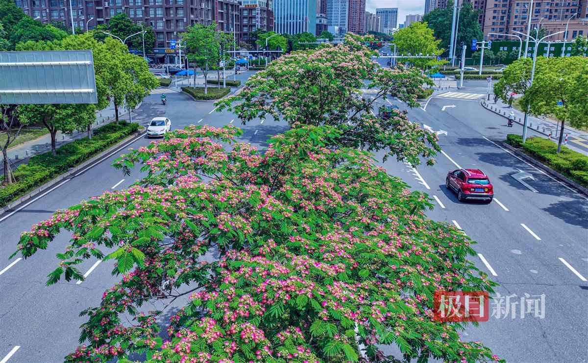 光谷一路街中合欢花绽放,灿若红霞