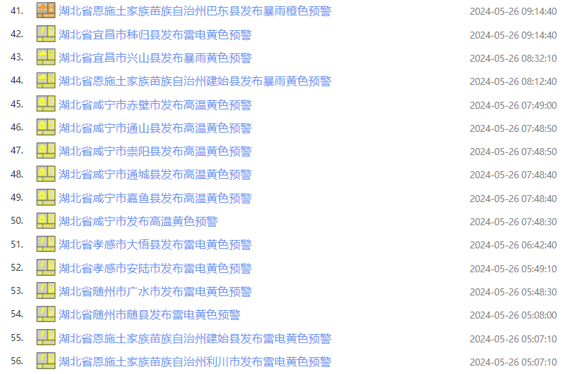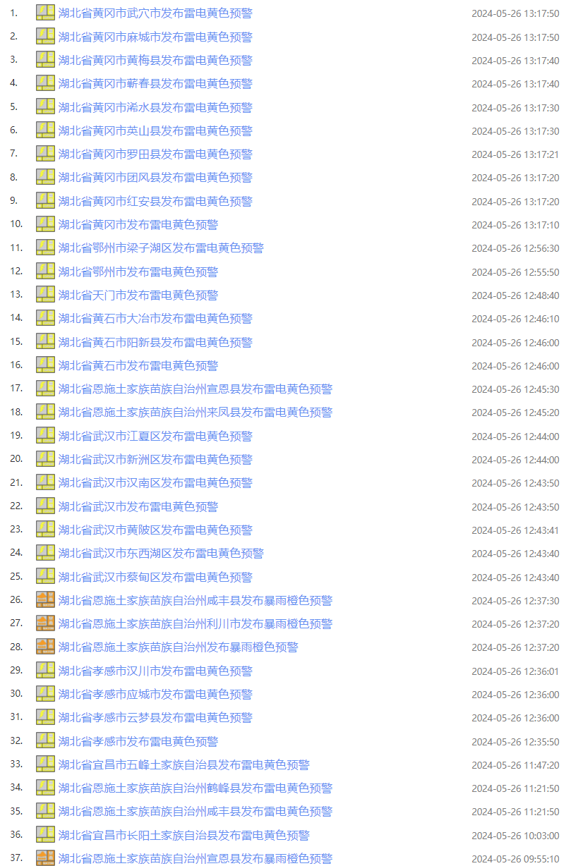 其中,恩施州气象台2024年05月26日12时37分发布暴雨橙色预警信号:预计未来3小时,利川市南部、咸丰县将有60毫米以上降水,阵风7-9级,伴有雷电、冰雹等强对流天气。请注意防范暴雨可能引发的山洪、中小河流洪水、城乡内涝、地质滑坡等次生灾害,及时疏散转移危险地带人员,确保交通运输、露天施工、旅游出行等户外活动安全。