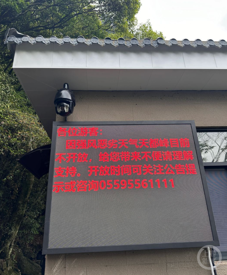 25日下午,有游客反映天都峰因为雷暴天气再度封闭,工作人员也紧急要求游客下山。26日上午,游客注意到,黄山景区发布通告,天都峰再度因为“强风恶劣天气目前不开放”。