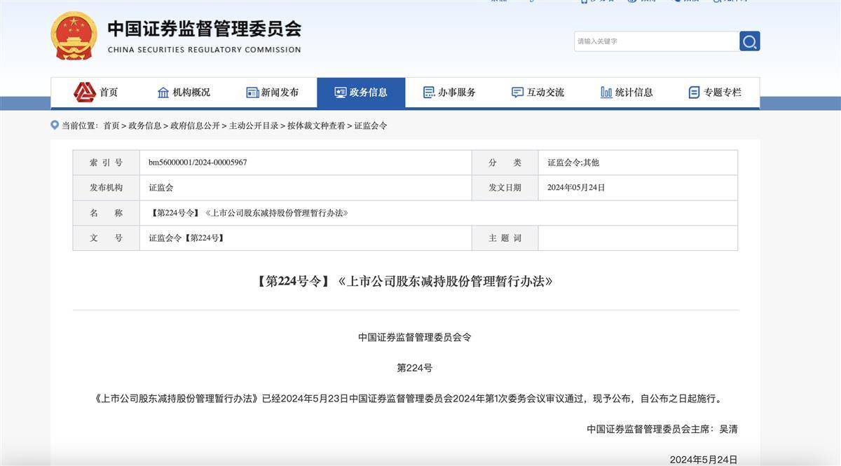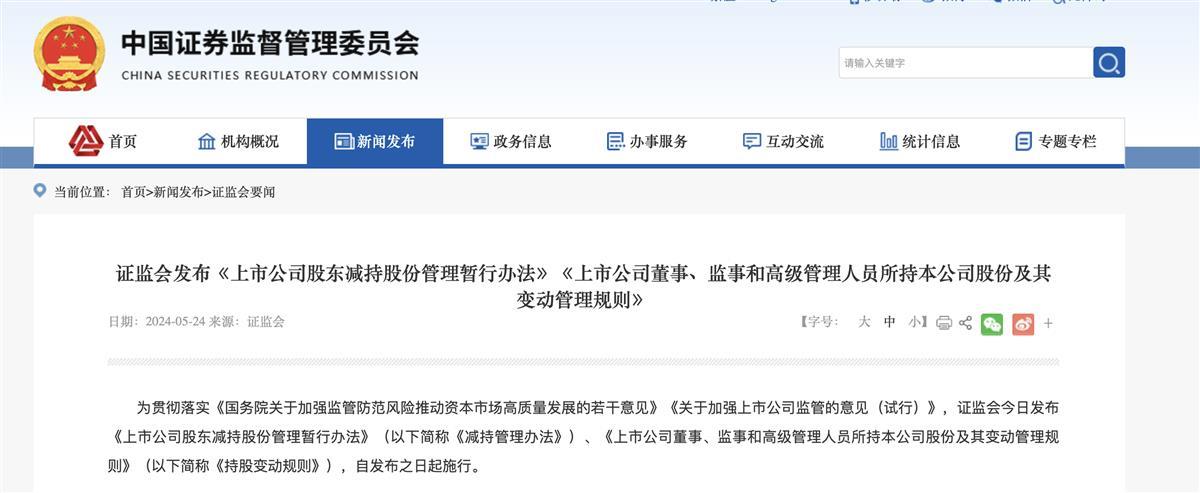 证监会近日发布减持新规(图源:证监会官网)