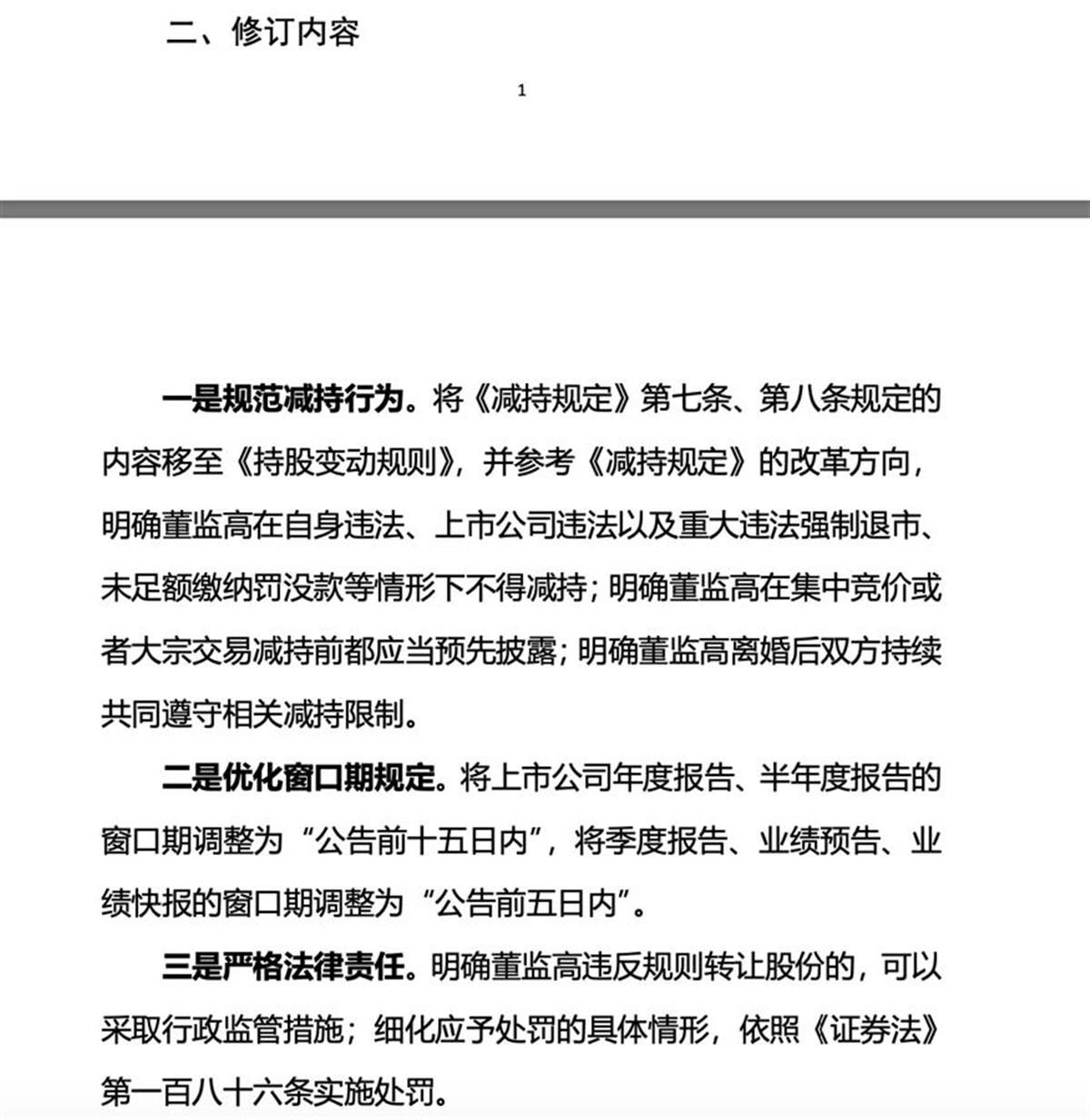 而本次修订后的《持股变动规则》,吸收整合了《减持规定》中有关规范董监高减持股份的要求,进一步明确董监高离婚分割股票后各方持续共同遵守原有的减持限制。其次,优化了禁止买卖股票的窗口期,支持董监高依法增持股份。将上市公司年度报告、半年度报告的窗口期调整为“公告前十五日内”,将季度报告、业绩预告、业绩快报的窗口期调整为“公告前五日内”。此外,严格法律责任。明确董监高违反规则转让股份的,可以采取行政监管措施。细化应予处罚的具体情形,依照《证券法》第一百八十六条实施处罚。
